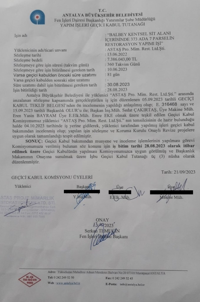 Antalya Büyükşehir Belediyesi yanan konağı mülk sahiplerinden 18 yıllığına kiraladıktan 13 gün sonra, 16 Nisan 2018 tarihinde “devlet konukevi” olarak kullanılmak üzere Valilik birimlerince restorasyonunun yapılması için Antalya Valiliği’ne tahsis etti. Dönemin Antalya Büyükşehir Belediyesi Genel Sekreteri, günümüzde ise Şırnak Valisi olan Birol Ekici’nin ‘Olur’uyla yapılan bu tahsisin ardından yangında kullanılamaz hale gelen tarihi konakta restorasyon süreci 2022’de başlatıldı. Sözleşme gereği Büyükşehir Belediyesi yanan konak için yaklaşık 3 yıl hiçbir işlem yapılmamasına rağmen kira ödemeye devam etti.