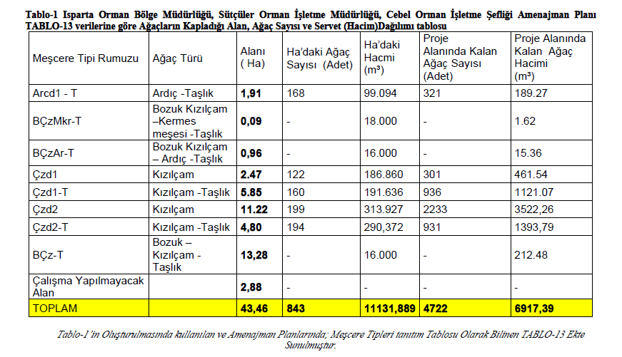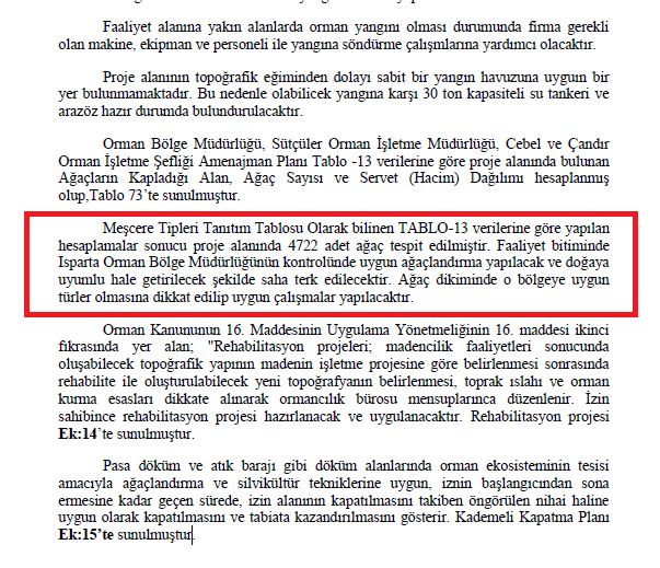 Zengin biyolojik çeşitliliğe sahip bir bölgede yer alan proje sahasında bulunan ağaç türleri arasında ardıç, kızılçam, karaçam, meşe ve seyrek olarak sedir yer alıyor. Isparta Valiliği Çevre, Şehircilik ve İklim Değişikliği İl Müdürlüğü’nün ‘ÇED Olumlu’ kararı verdiği proje dosyasında, ruhsat sahasında hâkim olan kızılçam ve karaçam orman örtüsünün yakın çevrede de yayılış gösterdiği savunularak “Alandaki yapının diğer alanlarla aynı niteliklere sahip olması inşaat ve işletme dönemlerinde alanı kullanan türlerin yakın bölgelerdeki aynı habitatlara geçiş yapabilecekleri anlamına gelmektedir” denildi.