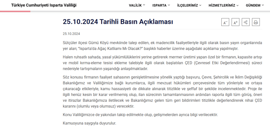 Projeyle ilgili kapasite artışının gündeme geldiği 25 Ekim 2024 tarihinde bir açıklama yapan Isparta Valiliği, kent kamuoyunda ağaç katliamı yapılacağı yönündeki endişeler üzerine projeyle ilgili ÇED sürecinin devam ettiğini belirtmişti. Söz konusu firmanın kapasite artışına yönelik başvurusunun Valilik ve ilgili kurumlarca tüm yönleriyle titizlikle ve şeffaf şekilde incelendiği belirtilen açıklamada, “Proje ile ilgili henüz kesin bir karar verilmemiş olup, ilan sürecinin tamamlanmasının ardından raporla ilgili tüm görüş, öneri ve itirazlar Bakanlığımıza iletilecek ve Bakanlığımız gelen tüm geri bildirimleri titizlikle değerlendirerek nihai ÇED kararını (olumlu veya olumsuz) verecektir. Konu Valiliğimizce de yakından takip edilmekte olup, gelişmelerden ayrıca bilgi verilecektir” ifadelerine yer verilmişti.