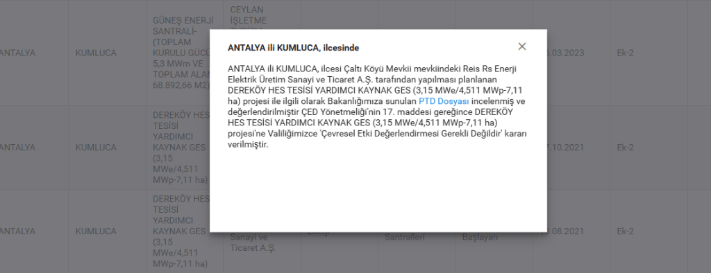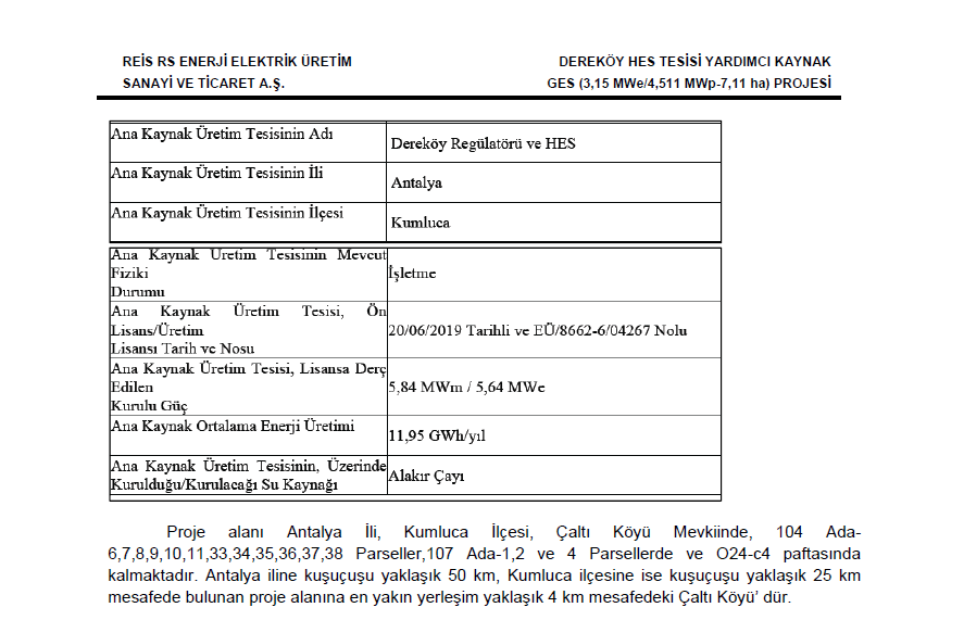 Kumluca Alakır Vadisi’nde inşa edilen HES’lerden biri olan Reis Enerji’ye ait Dereköy HES için de ‘yardımcı kaynak’ arayışı başladı. Dereköy HES’e yardımcı bir Güneş Enerjisi Santrali (GES) kurmak için hazırlanan proje için 7 Ekim 2021’de ÇED Gerekli Değildir Kararı verildi. Vadi içindeki proje alanında bulunan vatandaşlara ait nar ve zeytin bahçeleriyle bazılarında narenciye de bulunan araziler için 17 Temmuz 2025 tarihinde Cumhurbaşkanlığı Kararı ile acele kamulaştırma kararı çıkarılınca köylüler şaşkına döndü. Karar, toplam 40 bin 200 m2’den oluşan özel mülkiyete ait 9 parseli kapsıyor.