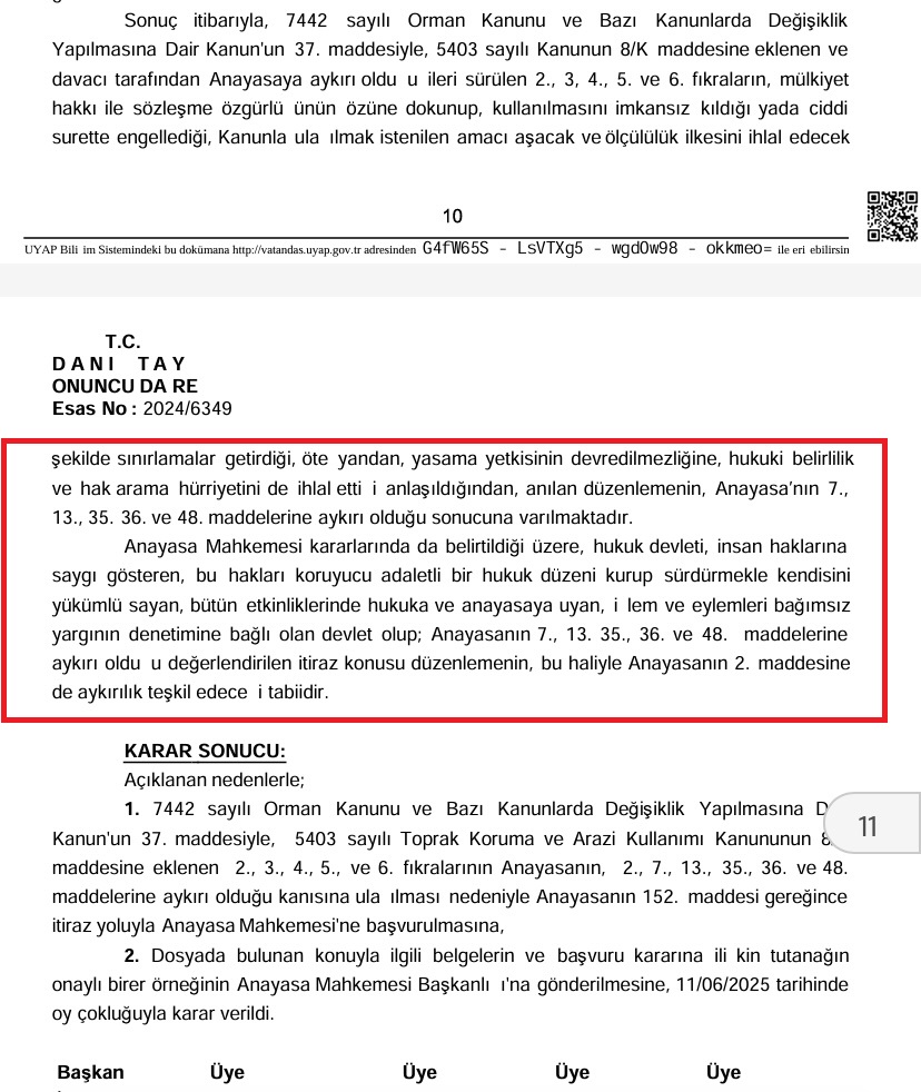Yönetmeliğin, 7442 sayılı Orman Kanunu ve Bazı Kanunlarda Değişiklik Yapılmasına Dair Kanun’un 37. maddesiyle, 5403 sayılı Toprak Koruma ve Arazi Kullanımı Kanununun ilgili maddelerinin yanı sıra Anayasaya aykırı olduğu kanısına ulaşıldığı kaydedilen Danıştay 10. Dairesi, oy çokluğu ile alınan kararda, dosyanın Anayasa Mahkemesi’ne gönderilmesine karar verdi.