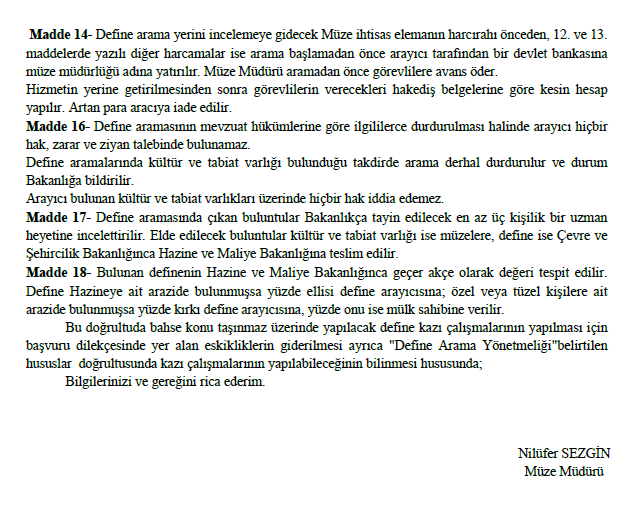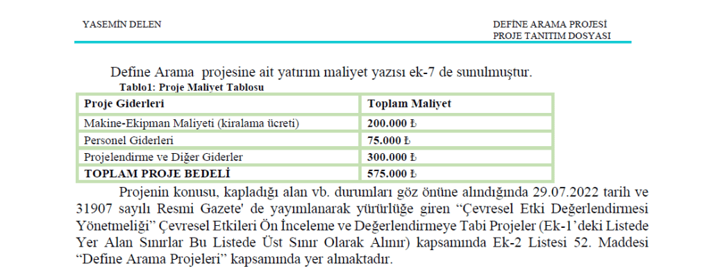 “Proje sahasında define bulunması halinde Hazine ve Maliye Bakanlığınca geçer akçe olarak değeri tespit edilerek maddi kazanç sağlanacaktır…”