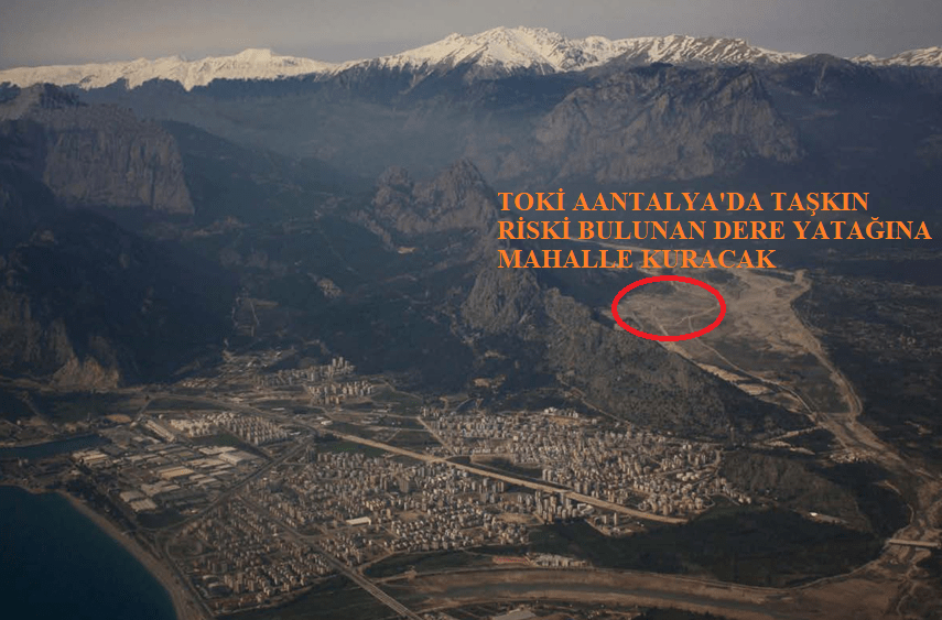2016 yılında, dönemin Orman ve Su İşleri Bakanlığı tarafından hazırlanan Antalya Havzası Taşkın Yönetim Planı’nda da bölge taşkın riski bulunan yerler arasında gösteriliyor. Dere yatağı ve dağ eteğindeki arazi, hızlı gelişen seller için de risk taşıyor. Ancak TOKİ’nin hazırladığı ÇED raporunda (Proje Tanıtım Dosyası), “Planlanan proje sahasında proje kriterlerini etkileyecek yavaş gelişen, hızlı gelişen ve ani gelişen seller söz konusu değildir” ifadelerine yer verilmesi dikkati çekiyor.
