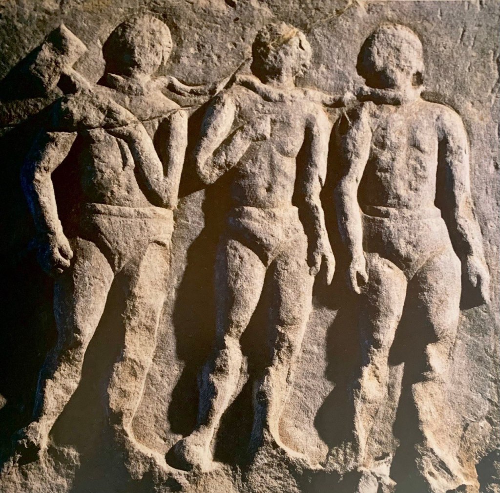 (Smyrna antik kentinde bulunan, MS 200’e tarihlenen Roma dönemine ait kabartma üzerinde zincire vurulmuş köleler. Aktüel Arkeoloji Dergisi, Sayı: 106, Eylül-Ekim 2025 )