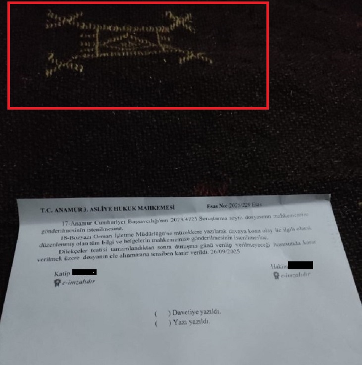 Anamur 3. Asliye Hukuk Mahkemesi, orman idaresinin zarar gördüğü iddiasıyla açılan davada Çoban Hasan Kızmaz’ın yasal faiziyle birlikte 728 bin TL para cezası ödemesi talebiyle ilgili kararı ileri bir tarihe erteledi. Bozyazı Orman İşletme Müdürlüğü’nden olayla ilgili tüm bilgi ve belgelerin Mahkemeye gönderilmesi istenirken, Çoban Hasan Kızmaz’a gönderilen tebligatın geleneksel motiflerin süslediği, keçi kılından dokunmuş bir kilimin üzerinde okunması dikkat çekiyor. Mahkemenin Orman İdaresinin talebi doğrultusunda karar vermesi durumunda heybelerin, kilimlerin nakşını yaratan bir geleneğin temsilcisi olan Çoban Hasan Kızmaz, yasal faiziyle birlikte 1 milyon TL’nin üzerinde para cezası ödemek zorunda kalacak.