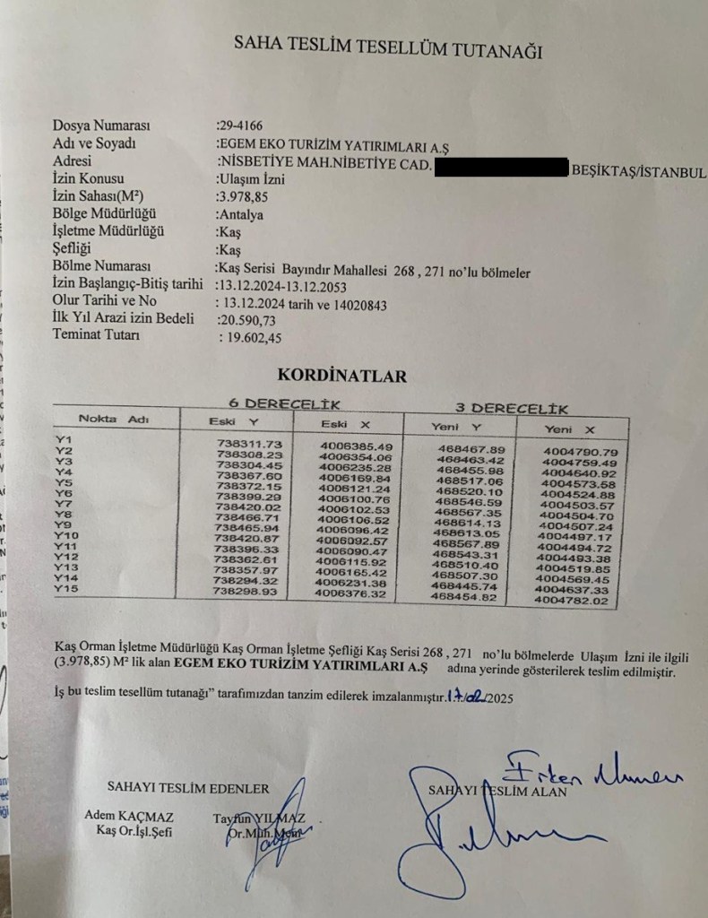 Antalya’nın Kaş ilçesinde karadan ulaşımı bulunmayan ve yalnızca teknelerle ulaşım sağlanan Limanağzı Koyundaki arazi için yol izni verildi. Eski Kültür ve Turizm Bakanlarından Erkan Mumcu’ya ait olduğu öğrenilen şirkete verilen yol izni, yaklaşık 4 bin m2’lik orman arazisini kapsıyor. Karadan ulaşım talep edilen yaklaşık 17 bin m2’lik arazi ise zeytinlik niteliğinde…