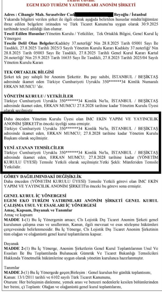 Antalya Orman Bölge Müdürlüğü’nün 3978 m2’lik orman arazisinden yol açılması için izni verdiği İstanbul merkezli Egem Eko Turizm Yatırımları Anonim Şirketinin, eski Kültür ve Turizm Bakanı Erkan Mumcu’ya ait olduğu ortaya çıktı. Mayıs 2022’de yine Mumcu’ya ait olan IMC Ekin Yapım ve Yayıncılık AŞ. tarafından kurulan şirketin 27 Ağustos 2025 tarihinde alınan yönetim kurulu kararına göre eski Bakan Erkan Mumcu’nun, Ağustos 2028’e kadar şirketin yetkilisi olarak atandığı görülüyor.