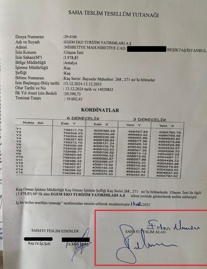 Eski Bakan Mumcu’ya ait olduğu görülen İstanbul merkezli Egem Eko Turizm Yatırımları AŞ’ye yol için verilen orman izninin, 2053 yılına kadar süresi olduğu görülüyor. Eski Bakan Mumcu’nun ıslak imzasıyla teslim alınan orman arazisi yaklaşık 4 bin m2’yi buluyor. İzin belgesinde yer verilen koordinatlara göre Limanağzı’nın kuzeydoğu bölgesinden başlayan yol, denize kıyısı olan 16.6 dekarlık zeytinlik araziye ulaşıyor. Özel araziye yol açılması için orman izni verilmesiyle ilgili Olur tarihinin 12 Aralık 2024 olduğu görülüyor. Kaş Orman İşletme Müdürlüğü tarafından 17 Şubat 2025 tarihinde düzenlenen yolla ilgili saha teslim tutanağına göre ilk yıl için belirlenen arazi izin bedelinin ise 20 bin 590 TL olduğu görülüyor.